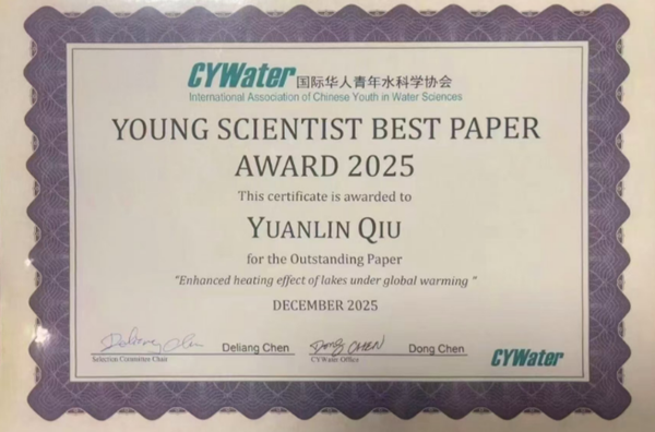 近日,在2025年美国地球物理联合会(AGU)秋季年会期间,我院青年科技工作者邱元霖博士因其在《自然·通讯》(Nature Communications)期刊上发表的研究论文《Enhanced heating effect of lakes under global warming》获评国际华人青年水科学协会(International Association of Chinese Youth in Water Sciences,CYWater)颁发的“青年科学家优秀论文奖”(Young Scientist Outstanding Paper Award)。邱元霖博士为水文水资源研究所“生态水文与水环境”研究室成员,主要从事高寒流域水文气象与陆气耦合相关领域的研究,该获奖论文首次揭示了全球变暖下寒区湖泊对大气的热量反馈机制。