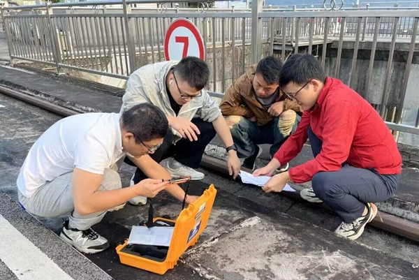 课题攻关团队对大坝进行了踏勘,结合示范技术要点与隔河岩大坝管理部门研讨了现场工作方案。利用无人机航拍与图像建模技术,复刻了大坝三维空间模型,掌握了坝面裂缝的基本分布规律。针对大坝泄水孔出水段边墙、升船机门机梁和公路桥梁等容易出现结构性裂缝的关键部位,进行了荧光激励探测。协同运用紫外光辐射可见光成像无人机、荧光喷液激励无人机,通过观察-激励-探明-定位全过程示范,实现了人员难达区域0.05mm宽度以下隐性裂缝的探测定位。运用雷达电磁场中指示剂示踪技术对坝顶裂缝深度进行了检测。通过现场测试研究,解决了荧光激励溶液对坝面环境的适应性问题,攻克了坝面复杂条件下隐性裂缝的精准识别与定位难题,推动了自研技术的成熟适用。
